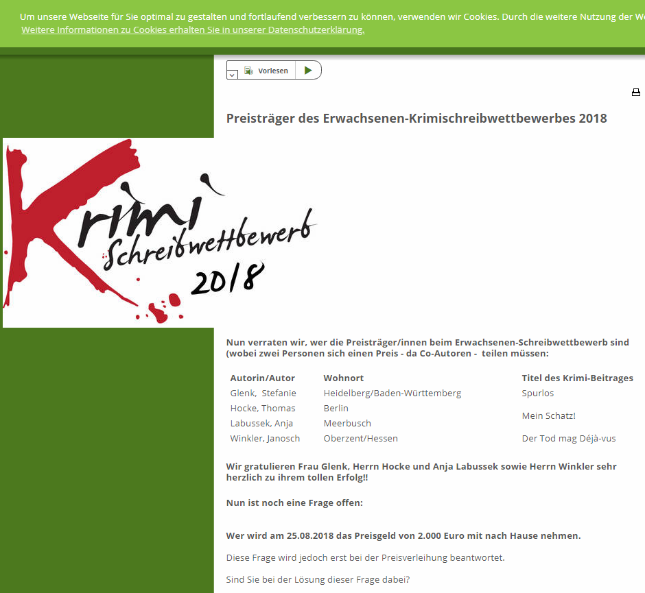 Nach dem unerwarteten Erfolg bei unserer ersten gemeinsamen Einreichung, dem Tatort Eifel (Wettbewerb Bereich Kurzgeschichten) im letzten Jahr, als wir uns ebenfalls in der Anthologie platzieren konnten, zu den sechs Nominierten für den Preis gehörten und in der Endrunde knapp gescheitert sind, haben wir dieses Mal einen Platz auf dem Treppchen bereits sicher.