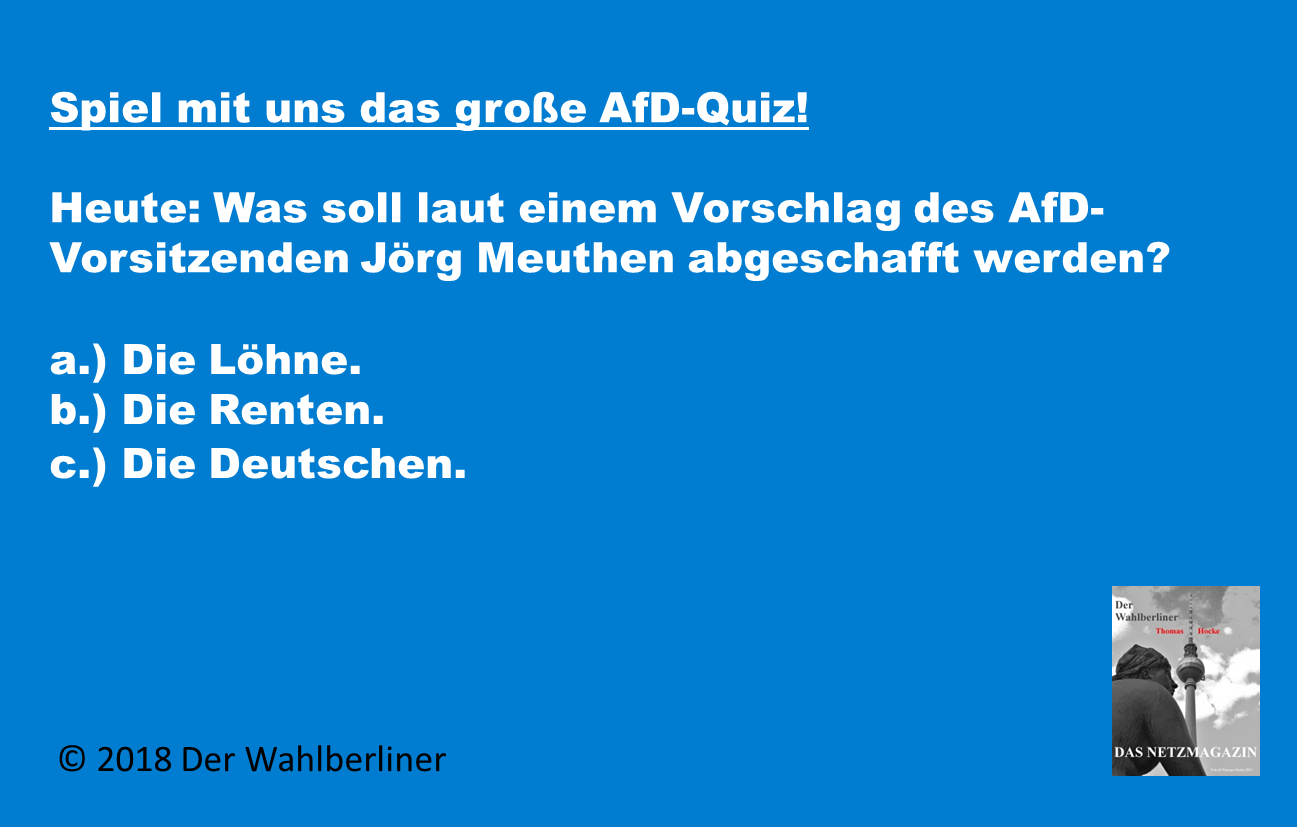 c.) Die Deutschen sind es auch nicht. Dies war vielmehr ein Vorschlag von Herrn Meuthens Bruder im Geiste Thilo Sarrazin, den dieser schon im Jahr 2010 gemacht hatte. Leider fanden die Menschen den Vorschlag dieses seltsamen Menschen etwas seltsam und seitdem steigt langsam, aber kontinuierlich die Geburtenrate. Was natürlich dazu führen wird, dass in einigen Jahren mehr Personen in Arbeit kommen und a.) haben möchten und in der Folge auch b.). Daher würden wir der AfD empfehlen, auf einem folgenden Parteitag c.) doch vorzuschlagen, um ihr im Folgenden erläutertes Altersvorsorgekonzept abzurunden.