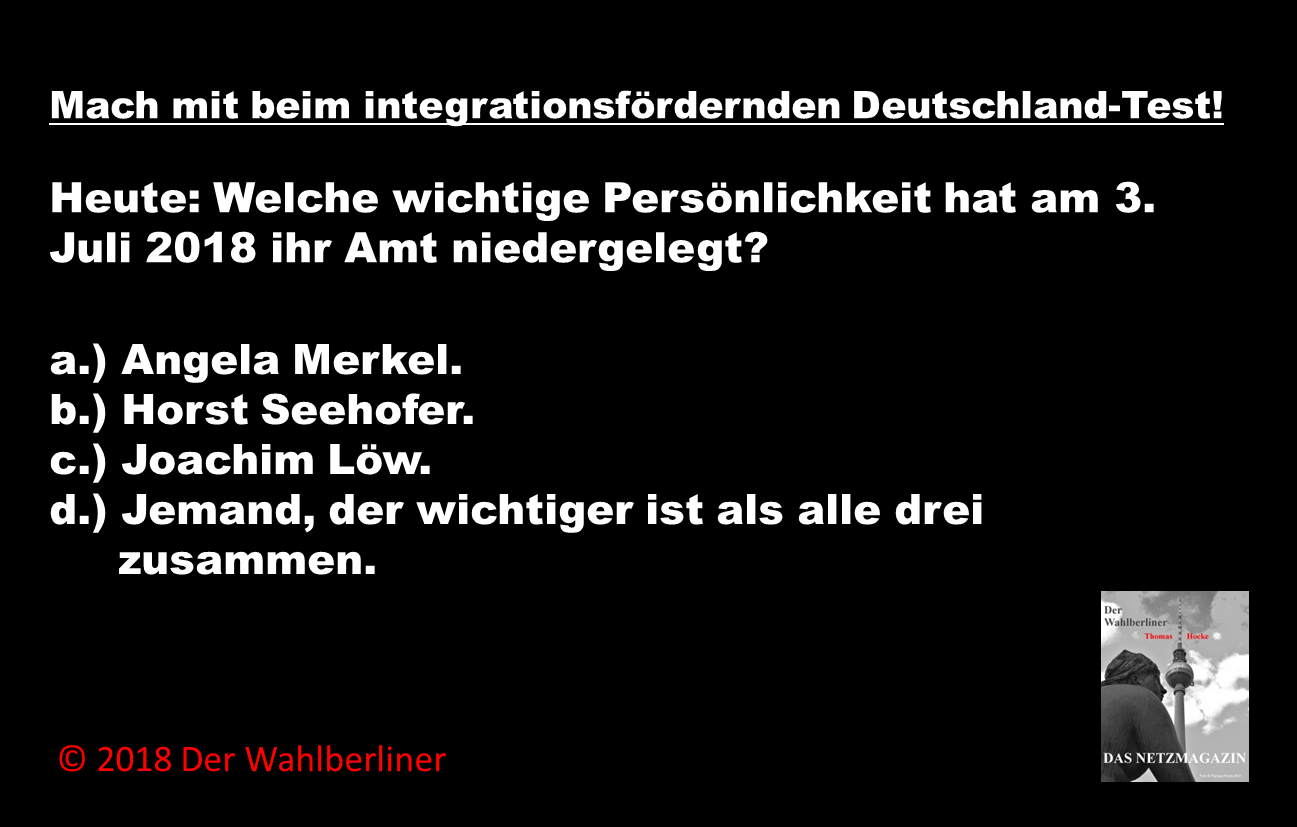 c.) Joachim Löw, obwohl er sein Team bei der WM 2018 in der Vorrunde mit aller Kraft ins Aus geführt hat, um wieder eine geschichtlich einmalige Leistung zu vollbringen und anschließend alle Qualifikationen gerissen hat, zuletzt trotz einer eigens durch DFB-Lobbyismus bei der FIFA für ihn eingerichteten WM-Quali-Gruppe mit Gibraltar, Liechtenstein und San Marino, will seine Freundin Angela beim Murksen für oder gegen Deutschland nicht allein lassen. Daher hat er eigenständig entschieden, dass er zu sehr an seinem immer noch prestigeträchtigen Posten hängt, um den Weg für einen Neuanfang nur 22 Jahre nach dem letzten Titel, den Lahms und Schweinis Willenskraft ihm geschenkt haben und 18 Jahre nach der letzten bei einem Turnier erreichten Vorrunde schon freizumachen.