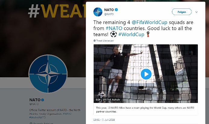 Eigentlich wollte ich jetzt nur noch Beiträge für die kommenden Tage entwerfen, weil der Wahlberliner seine Ziele für heute erfüllt hat, aber aus Aktualitätsgründen muss dieser Kommentar doch noch raus. Ich dachte wirklich, ich sehe nicht richtig, als ich von diesem Tweet überrascht wurde, den die NATO gestern Abend nach dem Spiel Kroatien-Russland abgesetzt hat.