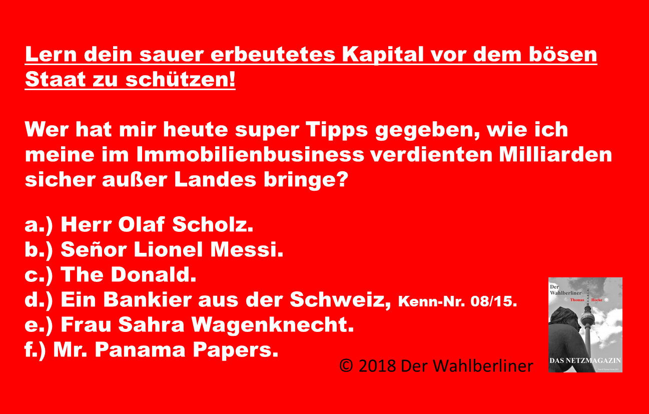 e.) Es war wirklich Sahra Wagenknecht, die in der aktuellen Mail an ihr Unterstützerteam empfohlen hat, dieses Spiel zu spielen. Es heißt „Tax Heaven“ und natürlich habe ich die zu meiner Biografie perfekt passende Figur „Edmund von Kronen“ gespielt.