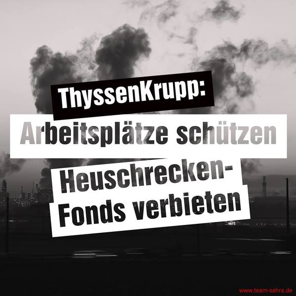 Sahra Wagenknecht, Wochenmal ans „Team Sahra“ vom 22.07.2018: „Durch den US-Fonds Elliott droht dem Unternehmen ThyssenKrupp eine Zerschlagung und in der Folge der Verlust von tausenden von Arbeitsplätzen. Als ich in der zurückliegenden Woche davon gelesen habe, fand ich das gleich doppelt problematisch: Zum einen natürlich aufgrund der konkreten Gefahr für die zahlreichen Beschäftigten des Unternehmens. Zum anderen auch, weil die Bundesregierung sich in dieser Situation wieder einmal gewohnt passiv verhielt. Nötig wäre es statt dessen, endlich politisch gegen Hedgefonds, Private-Equity-Fonds und dergleichen vorzugehen. Solche Heuschrecken brauchen politische Grenzen – nicht Tatenlosigkeit!“