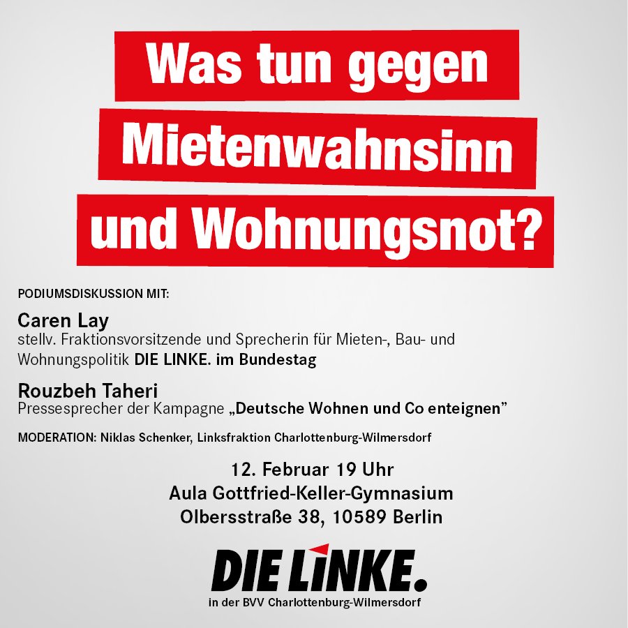 Er wird mit Caren Lay, der stellvertretenden Fraktionsvorsitzenden und Sprecherin für Mieten-, Bau- und Wohnungspolitik der LINKEn im Bundestag zu dieser Veranstaltung nach Charlottenburg kommen, zu der DIE LINKE im Bezirk eingeladen hat: „Was tun gegen #Mietenwahnsinn und #Wohnungsnot? Darüber diskutieren wir mit CarenLay von der Linksfraktion im Bundestag und Rouzbeh Taheri von dwenteignen in der Aula des Gottfried-Keller-Gymnasiums.“
