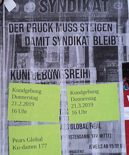 Derzeit besetzen die Betreiber des Syndikats ihre Räume, die ihnen zum 31.12.2018 gekündigt wurden. Gegen die Räumung wird am 21. Februar demonstriert: Kudamm 177 (Sitz der zuständigen Pears Global-Einheit), 16 Uhr.