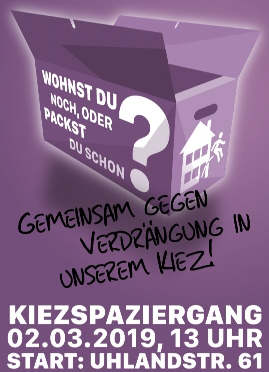 Setz auch du ein Zeichen gegen den #Mietenwahnsinn und spaziere mit am 02.03.2019! Start: 13 Uhr in der Uhlandstraße 61.“