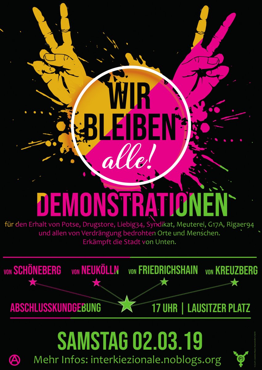 Die Autonomen Jugendzentren Potse und Drugstore, die Kiezkneipen Syndikat und Meuterei, die Häuser und verdrängungsbedrohten Projekte Großbeerenstraße 17a, Liebigstraße 34 + Rigaer Straße 94 und Kiezladen Friedel 54,
