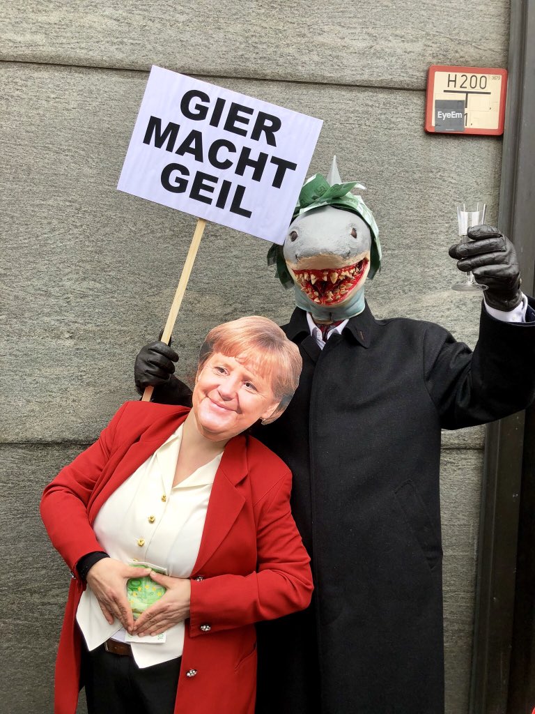Suchen wir die Verantwortlichen heim – an ihren Treffpunkten … und halten wir ihnen einen Spiegel vor: Eine feucht-fröhliche HAI-Society mit Sekt und originellen Schildern, prominent besetzt mit Warren Buffet als Neuberliner, Michael Zahn als Chef der Deutsche Wohnen, Horst Seehofer als immobiler HAImat-Minister und weiteren Promis belustigt sich über die vermeintlich wehrlosen Berliner Mieter*innen. Der HAI hat den Bären fest gepackt.