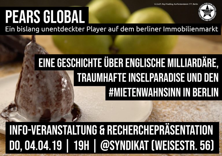 Damit wir syndikatmäßig nicht aus der Übung kommen, nach unserem Bericht über den Spaziergang durchs Neuköllner Schillerkiez am gestrigen Sonntag nun eine Ankündigung. Die Kiezkneipe „Syndikat“, die gestern auch zentraler Anlaufpunkt war, enthüllt mehr Details zu ihren Pears-Global-Recherchen!