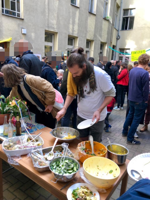 ... einmal erdacht, als sie zum Kaffee bei einem bedrängten Haus in Pankow eingeladen war. Menschen von der Box 32, die schon einen langen Tag hinter sich haben, freuen sich über leckere Speisen.