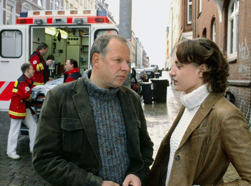 Borowski hätte Frau Ostendorf mit Leichtigkeit zum Tanz bitten können, die Gelegenheit wird er in einem Tatort nicht mehr haben (weil Verena Araghi, die in „Schichtwechsel“ als Frau des Werfteigentümers Ostendorf auftritt, nicht mehr als Schauspielerin, sondern mittlerweile journalistisch arbeitet). Da war eine sichtbare Chemie. Solche Szenen, dazu gehört auch jene, in der Borowski der Sekretärin Tatjana (Stefanie Stappenbeck) ein Tuch in die Hand drückt, ganz sanft, gleichen seine damals noch ziemlich trockene Art in aus – und die Tatsache, dass er mit seinem Assistenten Zainalov ziemlich ruppig verfährt. Dafür knistert es zwischen Frieda Jung und dem Kommissar, obwohl die Annäherung ersichtlich ein Langfristprojekt darstellt und noch viele Lampen durchs Präsidium wandern müssen, bis Borowski die Sterne sehen kann.