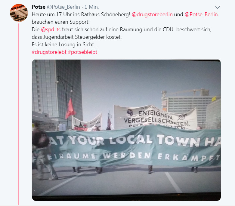 Unser letzter Beitrag für die bedrohten Jugendzentren Potse & Drugstore stammt vom 7. Juni und heute sind sie Thema in der Versammlung der Bezirksverordneten von Tempelhof-Schöneberg.Leider haben wir keine Zeit mehr, uns inhaltlich zu äußern, aber wir haben hier den Beitrag vom 7. Juni angehängt, damit klar ist, worum es geht. Doch noch ein Satz. SPD und CDU, also die Parteien, welche die Jugendzentren gerne weg hätten, kommen nach Umfragen in Berlin gerade noch auf 27-28 Prozent. Zusammen, nicht einzeln. Die Stadtgesellschaft will eine andere Politik! Eine Politik für Menschen.