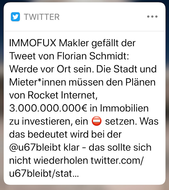 6. Juni 2019: Die Hausinitiative hat Rocket Internet auf deren Hauptversammlung besucht und damit große mediales Aufmerksamkeit erzielt. Wie man sieht, haben wir diesen an uns gerichteten Tweet nachgetragen, weil wir beim Durchpflügen der Twitter-Timeline der Urbanstraße offenbar an dem wichtigen Event vorbeigesegelt sind.