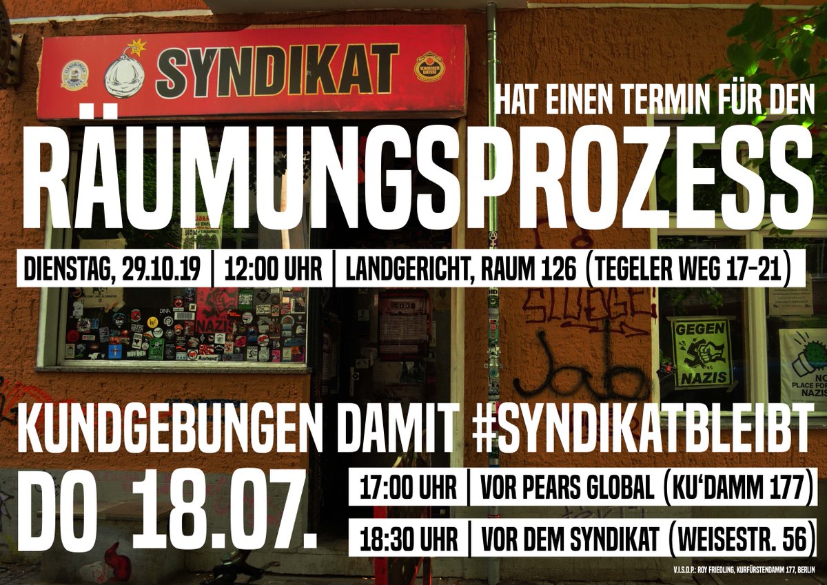 Das Syndikat liegt im gemütlichen Neuköllner Schillerkiez, in dem die Investoren in aller Gemütlichkeit die Menschen weggentrifzieren wollen, dagegen müssen wir uns alle wehren. Gruß auch an unsere Freunde dort!