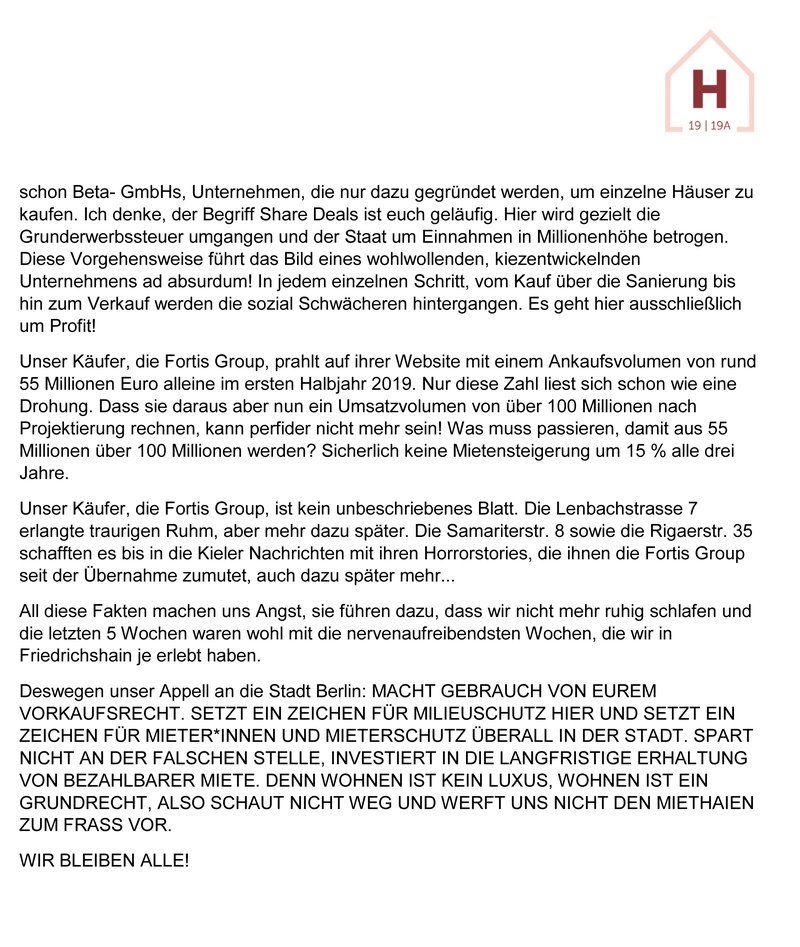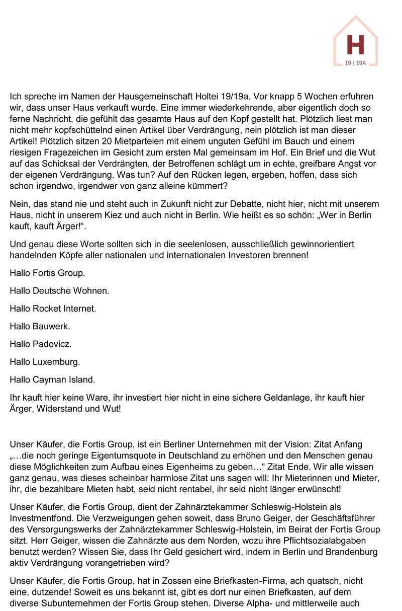 Gestern nun kam ein bemerkenswerter Appell von der Initiative der Holteistraße, der an die Stadt Berlin gerichtet ist und der sehr viel vom Mietenwahnsinn zusammenfasst – unter anderem unsere Standardforderung, endlich Share Deals zu verbieten, die den Milieuschutz ad absurdum führen.
