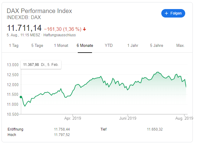 Der nebenstehende Sechsmonatschart sieht noch nicht so dramatisch aus wie der 5-Tage-Chart weiter oben: Das Jahr 2019 zeigt noch einen leichten Gewinn.