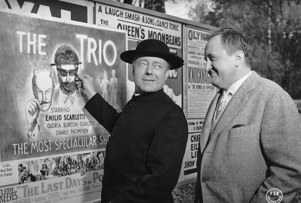 Vielmehr kommt es zu einer Auflösung, die uns wiederum Schwierigkeiten macht. Ist es, weil wir den Film mehrfach gesehen haben oder ist es, weil es so auf der Hand liegt, dass wir lange vor Pater Brown wissen, wie die Sache mit dem toten Banker und dem toten Theaterdirektor gelaufen ist? Leider haben wir nun einmal den Film schon mehrfach gesehen und können daher kaum beurteilen, ob wir schneller als Brown geahnt hätten, dass es Zwillingsbrüder gibt, von denen einer in Sachen Mord unterwegs ist, während der andere ihm das Alibi stellt. Eigentlich eine perfekte Sache, wenn da nicht diese Spiegelgeschichte im Theaterkeller gewesen wäre. Seltsam, so ein Spiegel an diesem Ort, aber wir wollen nicht zu fitzelig sein.