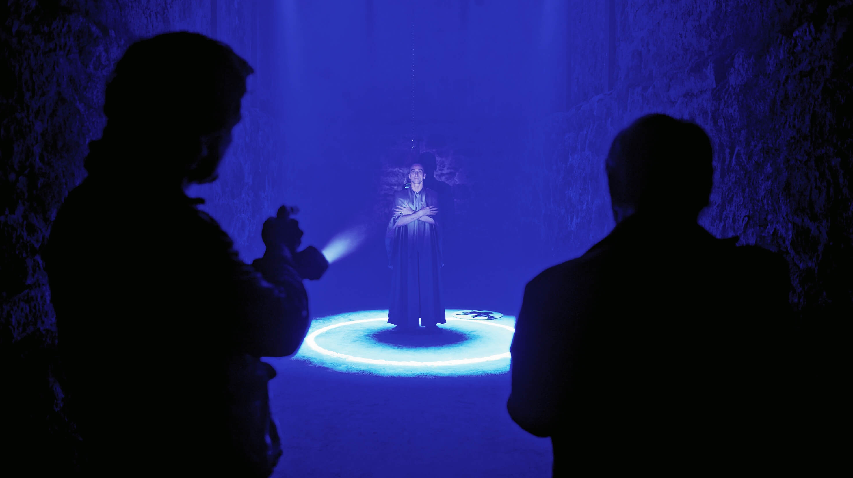Wir waren schon in Versuchung, das Blau, das wir seit einiger Zeit für die Schrift derHandlungsangabe verwenden, durch das Knallblau auszutauschen,in das die Szenerie während des Hexenrituals getaucht ist, aber wir wollten es nicht übertreiben. Wir wollten es aber nicht übertreiben. Wir schreiben hier auch gleich, 3,26/10, der aktuelle Punktestand für „Der Hüter der Schwelle“ – so schlimm wird es am Ende der Rezension nicht sein, das Fazit. Aber wir sind schon einigermaßen schockiert, dass sie in Stuttgart nach einigen großartigen Filmen, die sehr schön am Rande von Dichtung und Wahrheit, von Realismus und suggestiver Verdichtung entlang gestrickt wurden, so in die Grütze hauen. Einen wirklich schlechten Film oder auch zwei darf jedes große Team machen, damit sind wir ganz einverstanden, aber das hier.