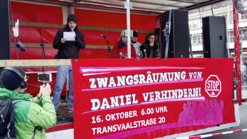 Den jungen Mann neben Daniel haben wir verpixelt und nennen auch nicht seinen Namen. Er wurde per Zwangsräumung verdrängt aus der Dubliner Straße 8 und kam mit viel Glück unter bei einer Genossenschaft. Hier die Geschichte vom bösen Ende des Kampfes gegen Verdrängung im Haus Dubliner Straße 8.