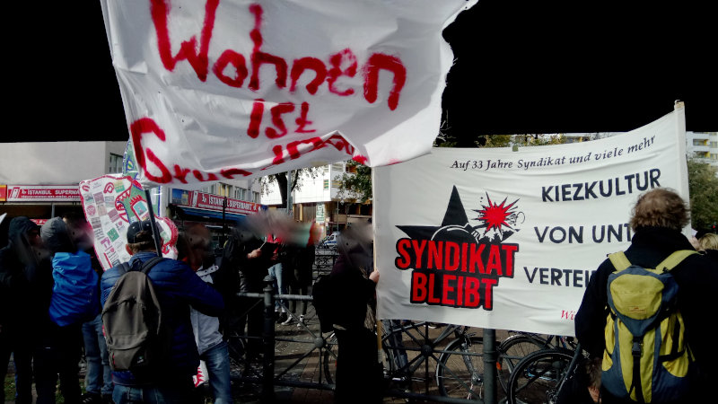 Ein Higlight gibt es aber auch schon hier: Wir grüßen die Widerständler der Kiezkneipe #Syndikat aus Neukölln, die #PearsGlobal enttarnt haben und gegenwärtig ihre aus Spekulationsgründen gekündigten Räume besetzen.