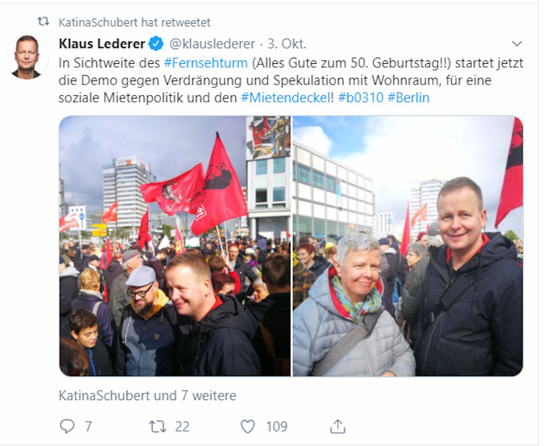 Wir fassen diese beiden Tweets so auf: Die Grünen und DIE LINKE stehen hinter den Mieter*innen. Die gezeigten Politiker*innen stehen stellvertretend für die Haltung ihrer Parteien. Sie waren nicht privat dabei, sondern, um ein deutliches Zeichen auch gegen das Verhalten ihres Koalitionspartners SPD zu setzen. Im Tweet von Canan Bayram findet sich zudem die Unterstützung des kompletten Mottos der gestrigen Demo im Text. Bei der LINKEn, die offiziell „DWenteignen“ unterstützt, gehen wir davon aus, dass sie die Lage ebenso bewertet. Klaus Lederer hat sich kürzlich insbesondere zum Verhalten der Genossenschaften geäußert.