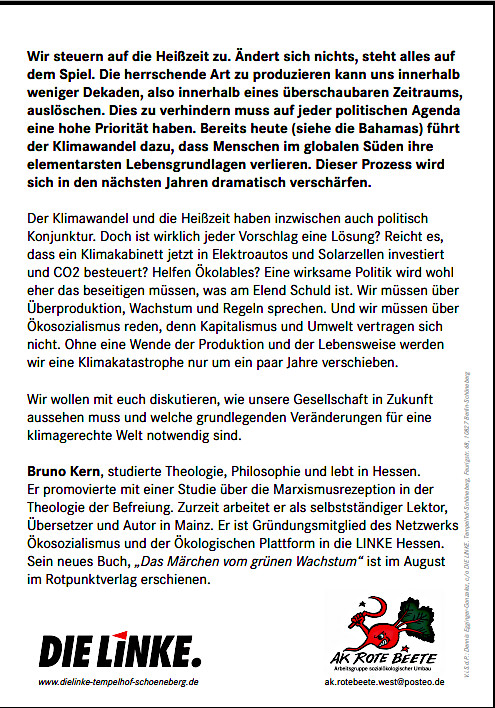 Der Arbeitskreis „Rote Beete“ der LINKEn in unserem Bezirk widmet sich Umweltthemen und wird von sehr engagierten jungen Menschen in der Partei betrieben – so etwas können nicht alle Bezirksverbände vorweisen und wir freuen uns, aus Überzeugung heute mal wieder eine Veranstaltung aus unserem Bezirk weiterleiten zu können. Später als geplant, wieder mal, aber wer echte Arbeit ausübt, dem kommt auch mal was dazwischen.