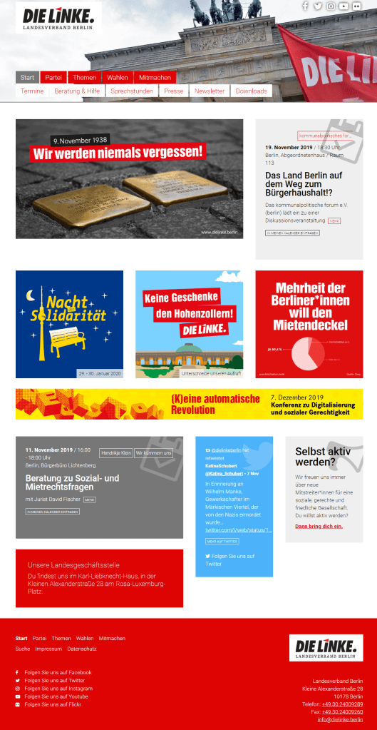 Wieso aber sieht die Startseite von DIE LINKE in Berlin, der Stadt, in der die Mauer stand, im Moment (Stand 9.11.19, 11:50 Uhr) so aus und auch beim Anklicken der Menüpunkte findet sich kein Satz zum 9. November 1989?
