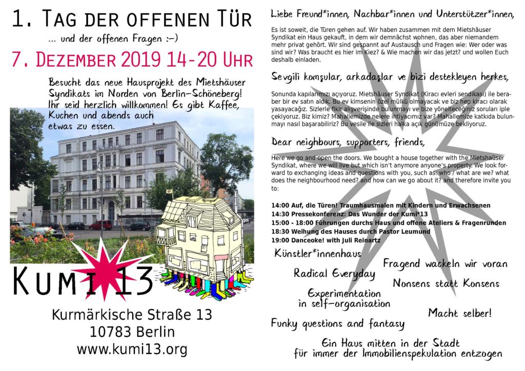 Zu Beginn fällt der Satz „In diesem Haus ist nichts gleich“. Gemeint sind die vier verschiedenen Heizungstypen, die unterschiedlich sanierten Wohnungen, die Grundrisse… Kurz: Dieses Haus ist eine Wundertüte – unsere Wundertüte! Wir haben das Haus in Berlin-Schöneberg gekauft und werden es gemeinsam zu neuem Leben erwecken. Dabei wollen wir die Vielfältigkeit des Hauses genauso wie die Heterogenität unserer Gruppe, Impulse, Vorstellungen erhalten – beides ist für uns sowohl Schatz als auch Herausforderung. Aus der Polyphonie entsteht ein Klang, der manchmal dissonant, mal harmonisch, aber immer wieder neu sein wird. Das ist die Kumi*13. Unser Hausprojekt in der Kurmärkischen Straße 13.