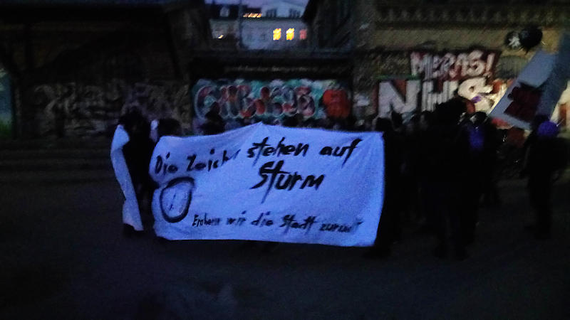 Das Ende des Gierkapitalismus zeichnet sich immer deutlicher ab, das schreiben wir nicht als heißen Wunsch in diesen Bericht, sondern ganz nüchtern: Entweder werden grundsätzliche ökonomische Parameter verändert oder wir werden alle mit diesem System draufgehen, wenn wir nicht den Mut haben, es loszulassen. Also das zu tun, was viele derer, die gestern unterwegs waren, bereits leben. Kollektive, solidarische und unkommerzielle Strukturen aus einer besseren Berliner Vergangenheit können uns helfen auf dem Weg in eine Zukunft, in der nicht mit dem Immobilienhype auch alles andere zusammenbricht. Man stelle nur die beeindruckende Kreativität und den Mut der Menschen, die gestern wieder auf dem Demo waren, den blutleeren, mit Geld anstatt Ideen mühsam auf den Weg gebrachten Kampagnen der Immobilienwirtschaft gegenüber, um zu verstehen, um was es geht und welche Verluste – erneut – drohen.