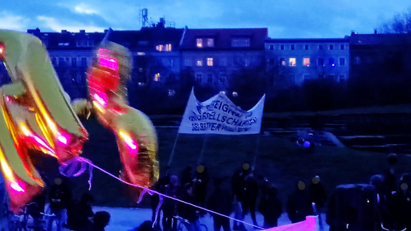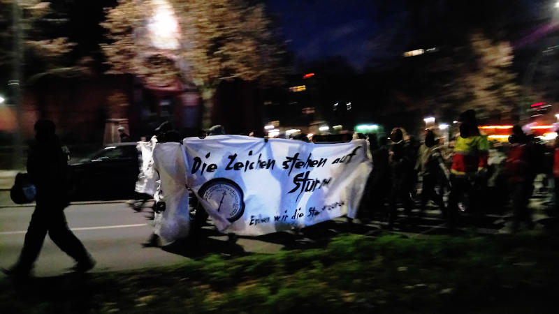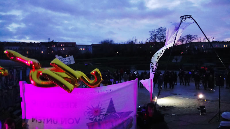 Die Situationen derer, die sich gestern in der Organisation und / oder mit Redebeiträgen eingebracht haben, ist durchaus unterschiedlich, aber dass 2020 nicht nur das Ende der Rendite-Blütenträume, sondern auch das Ende vieler linker Projekte bedeuten könnte, wäre die sogenannte Ironie der Geschichte: Das Beste geht mit dem Schlimmsten. Und irgendwo dazwischen stehen die meisten von uns und müssen sich eine Haltung angewöhnen, wenn sie bisher keine hatten. Daher ist dieser Bericht nicht für jene geschrieben, die sowieso Bescheid wissen und viel mehr Details über die Projekte kennen als wir, sondern für unser Publikum, das bisher eher aus dem Bereich der Hausinitiativen kommt, über die wir schon etwas länger schreiben, Mitglieder und Wähler*innen der LINKEn und der Grünen, aber eher selten in der IL und in den autonomen Teilen der Bewegung verortet – wenn man so will, auch für uns selbst. Dafür haben wir die Fotos gemacht, die etwas von der besonderen Atmosphäre wiedergeben sollen. Nicht eingebettet: Die wunderschönen Aufruf-Plakate, es gibt eine ganze Reihe davon. Man kann sie aber ebenfalls im Blog der Meuterei bewundern.