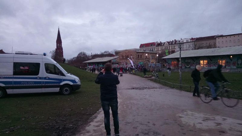 Wir haben in den Bildbeschreibungen auch einige Redebeiträge erwähnt – vornehmlich von jenen, die wir schon etwas besser kennen. Und man sieht auch die andere Seite: Welch eine ziemliche Angst die Staatsmacht vor ein paar linksorientierten Menschen haben, die im Grunde aus einer ganz defensiven Position, von Zwangsräumung bedroht oder schon geräumt, lediglich ihr Existenzrecht nicht einfach drangeben wollen. Wir alle haben es verpasst, den Anschluss an die 1970er und 1980er zu halten, als links noch auf dem Weg nach vorne war und es so aussah, als könne Berlin seinen Sonderweg weitergehen – im Schutz der Mauer allerdings, weil die Stadt damals für das Kapital nicht so interessant war wie heute, aller Subventionen zum Trotz.