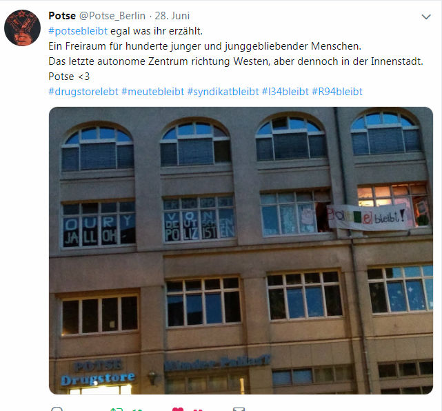Vielfach haben wir über die autonomen Jugendzentren Potse und Drugstore in Schöneberg geschrieben, in einem eigenständigen Beitrag zuletzt am 2. Juli 2019, sie seitdem mehrfach erwähnt, insbesondere, wenn es um Zwangsräumungen ging.