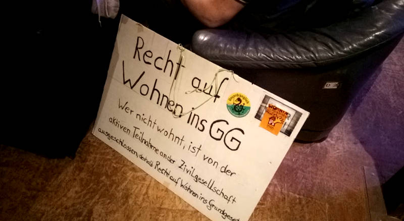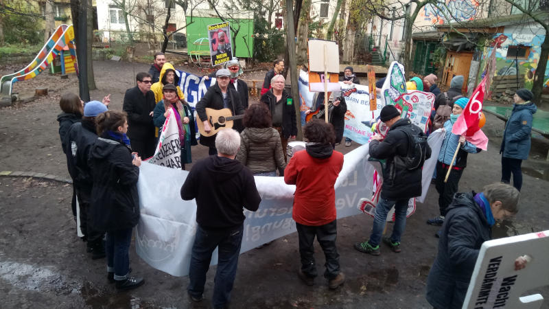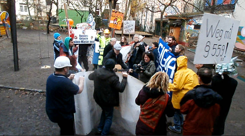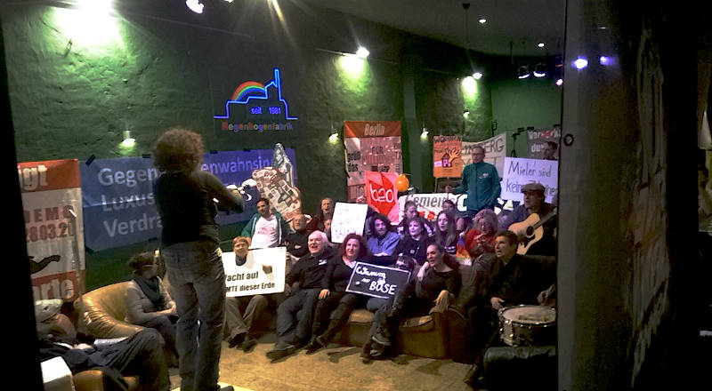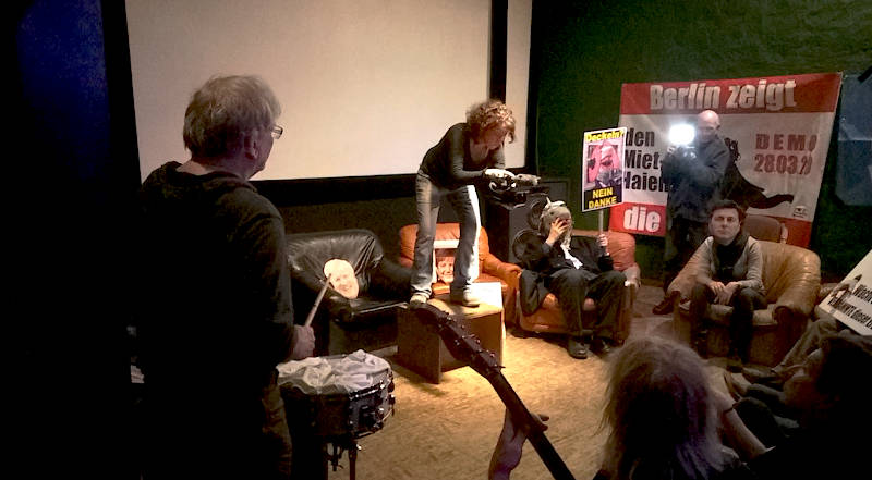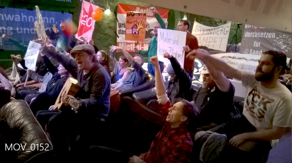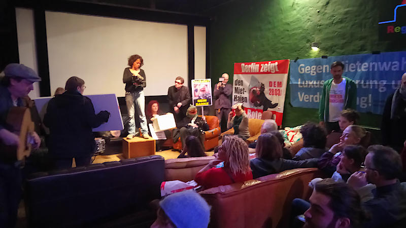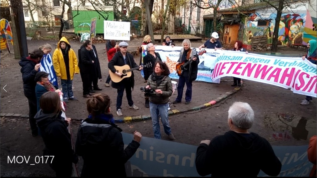 Dass wir Eindrücke von der spannenden gestrigen Veranstaltung zeigen dürfen, verdanken wir der sehr freundlichen Haltung des Bündnisses und seiner Teilnehmer*innen. Ein Dank geht an Ton Steine Scherben. Wir haben Gymmick gefragt, ob wir schon ein bisschen was zeigen dürfen, nicht nur Fotos, sondern auch kleine Ausschnitte vom Lied selbst, ein weiterer Dank an Kalle Gerigk aus Köln, mit dem der mittlerweile allgegenwärtige Ruf der Mieterbewegung „Wir bleiben alle!“ untrennbar verbunden ist und der gestern die Aktivist*innen super unterstützt hat – und besonders an Regisseurin Charlotte Schwalb, die uns ebenfalls gestattet hat, Ausschnitte aus unseren eigenen Amateuraufnahmen zu verwenden. Wir haben uns entschieden, den ersten kurzen „Trailer“ dem ersten Update vorzubehalten – und belassen es heute bei einer Fotostrecke, die den Abschluss dieses kleinen Berichts bildet.