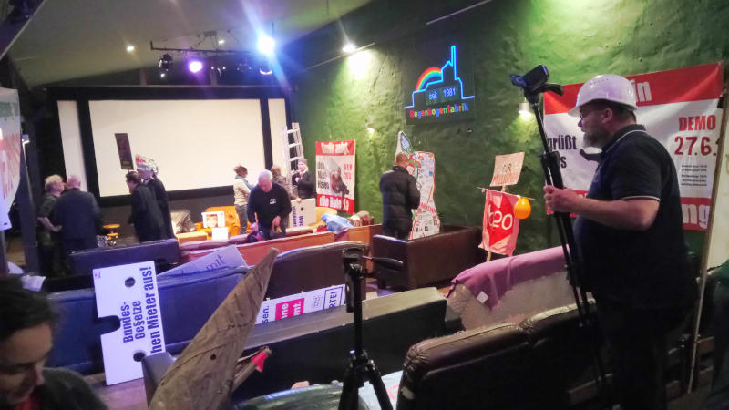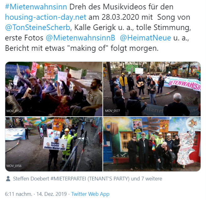 Wir waren am 14.12.2019 in der Regenbogenfabrik von Berlin-Kreuzberg, wo die Vorbereitungen für den Housing Action Day am 28.03.2020 einen vorweihnachtlichen Höhepunkt erlebten: Die Aufnahme des Musikvideos für diesen internationalen Demo-Tag im März des kommenden Jahres.