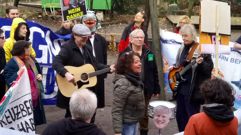Beitrag vom 15.12.2019: Initiatorin für den Housing Action Day ist, wie schon am 6. April 2019, das Bündnis Mietenwahnsinn und die Musik kommt originial von der Kultband Ton Steine Scherben. Genauer: von Kai & Funky von Ton Steine Scherben mit Gymmick, wie die Nachfolgegruppe der ursprünglichen Band heißt, die in den 1970ern den Sound des widerständigen Berlin lieferte. Seit 2015 tourt die Band in dieser Zusammensetzung, zwei von drei Musikern zählen zur Originalbesetzung bzw. sind seit den 1970ern dabei. Leadsänger und Gitarrist Rio Reiser, der 1996 verstarb, ist wohl das bis heute bekannteste Gründungsmitglied. Der Heinrich-Platz in Kreuzberg soll nach ihm umbenannt werden.