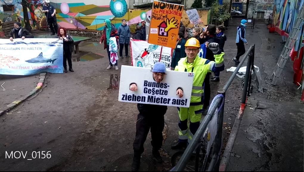 Das Video der Version für den Housing Action Day soll Mitte Januar 2020 offiziell erscheinen. Alles, was wir davor und danach an zusätzlichen Informationen anbieten, sehen wir als redaktionellen Beitrag, aber auch als Werbung für die große Mieterdemo 2020 an. Es ist heute ohnehin üblich, dass sich beides miteinander verbindet, aber nicht alle, vor allem nicht diejenigen, die für das Kapital schreiben, reden offen darüber, dass sie keineswegs „neutral“ berichten. Aus irgendeinem Update verschwindet diese Anmerkung vermutlich wieder, aber im Moment ist uns gerade danach, sie aufzuschreiben – man kann auch sagen, die Kampagnen der Vermieterlobby triggern uns und spornen uns an. Der Spaß an der Aktion war gestern so deutlich zu spüren, die Individualität und das Engagement der Beteiligten haben uns beeindruckt – und unwillkürlich zurückdenken lassen an die kleine Vermieter-Ansammlung am Montag zuvor. Wir haben hier einiges rausgekürzt, aber wir halten fest: Würde Berlin nur aus denen bestehen, die für endlose Mietsteigerungen demonstrieren, eine wahrlich verarmte Stadt wäre es. Schon deshalb, weil es keine Mietenden mehr gäbe, denen man möglichst viel vom Einkommen abnehmen kann.