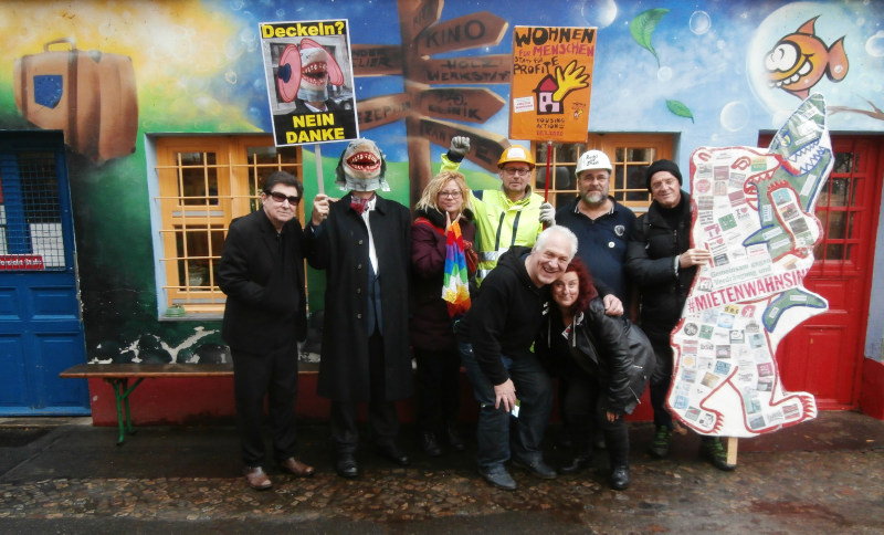 Abschlussbild v. l. n. r. u. a. mit Kurt Jotter (Büro für ungewöhnliche Maßnahmen), der Miethai (Gerd vom Sozialbündnis Treptow), Daniel Diekmann (HeimatNeue), Steffen Doebert (Mieterpartei), Peter vom rekommunalisierten Kosmosviertel, vorne Kalle Gerigk und Nicole Lindner (Mieterpartei)