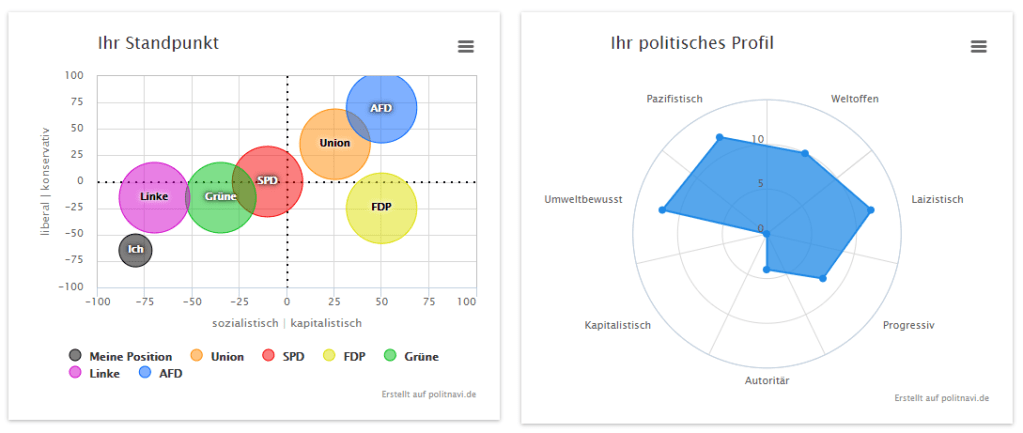 Vielleicht ist das auch gar nicht so erstaunlich, es kommt darauf an, welche Positionen man als denkbares Maximum in einer Richtung setzt. Das Politnavi orientiert sich erkennbar mehr am Spektrum der etwas größeren Parteien in Deutschland. Dass die CDU und die AfD etwa in gleichem Maße kapitalistisch sind, dass die FDP als weit rechts dargestellt wird, wundert mittlerweile niemandem mehr und die unterschiedlichen Auffassungen über autoritär und liberal hindern sie nicht daran, gegen die Mehrheit der Nichtkapitalisten zusammenzuarbeiten. Die CDU hingegen wird nach unserer Auffassung einen Tick zu weit weg vom Kapitalismus verortet, aber das ist auch durch die stärkere Wahrnehmung der Berliner Stadtpolitik bedingt – in Berlin stimmen ihre Positionen beinahe exakt mit denen der FDP überein.