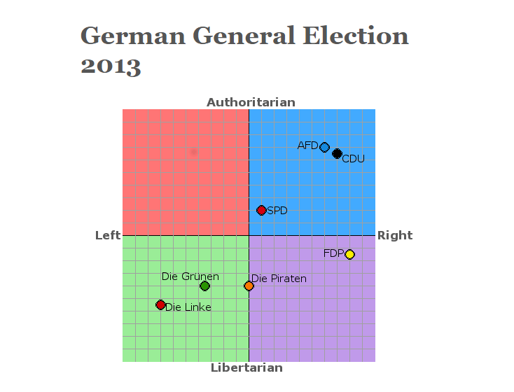 Ich finde es spannend, dass die Linke so rechts ist in deinem Diagramm. Allerdings ist die Skala auch sehr willkürlich. Was bedeutet denn der Schnittpunkt mit der Y-Achse? Ist das die Sozialdemokratie? Was ist der Schnittpunkt bei der Gesellschaftsordnung mit der X-Achse?