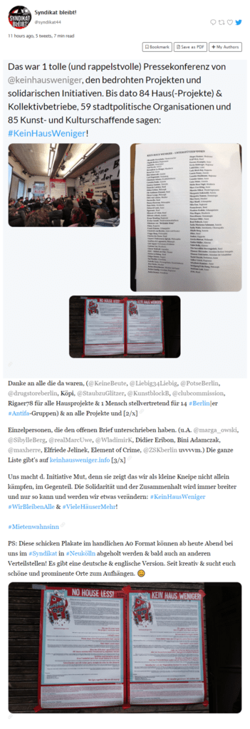 Wir starten mit der Darstellung der Neuköllner Kiezkneipe Syndikat zum gestrigen Ereignis, hier der Link zum Thread. Damit gehen auch wir vom Vertrauten hin zu etwas Neuem, denn über das Syndikat haben wir vielfach geschrieben und wir mögen die sprachlich und inhaltlich präzisen Darstellungen des Betreiberkollektivs. Deshalb haben wir diesen Bericht ausgesucht, um Eindrücke von der gestrigen Pressekonferenz zu vermitteln. Im Anschluss weitere Informationen zum Bündnis: