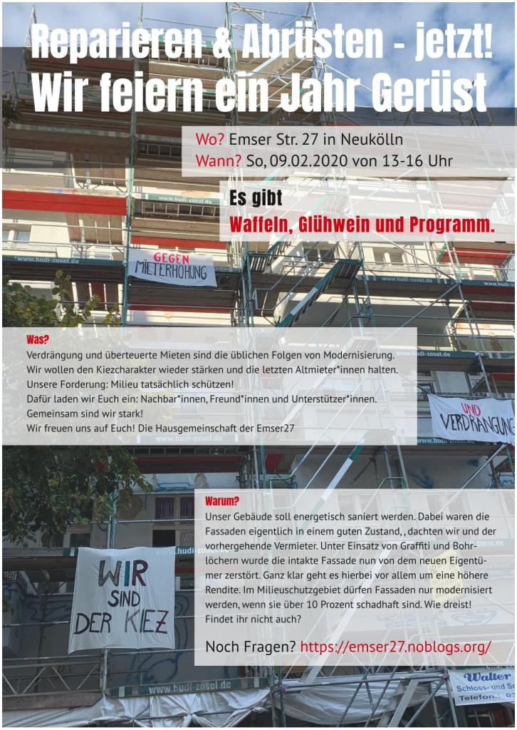 Die Gerüstfeier findet am 09.02.2020 von 13 bis 16 Uhr im Hof der Emser Straß 27, 12051 Neukölln statt, mit Waffeln, Glühwein und Programm.