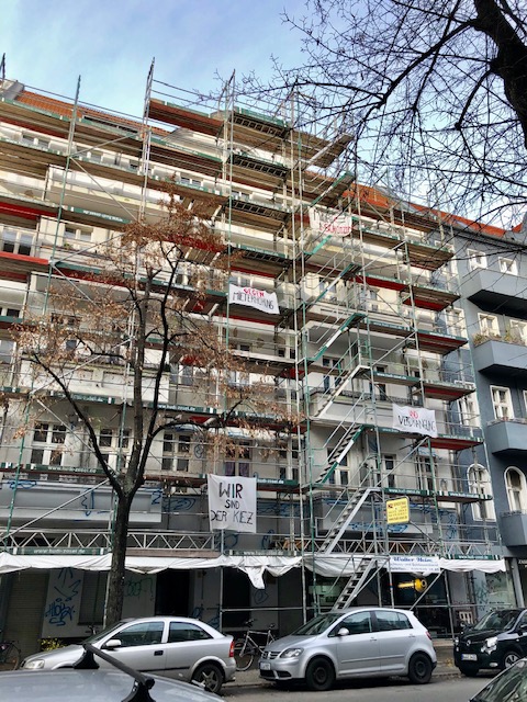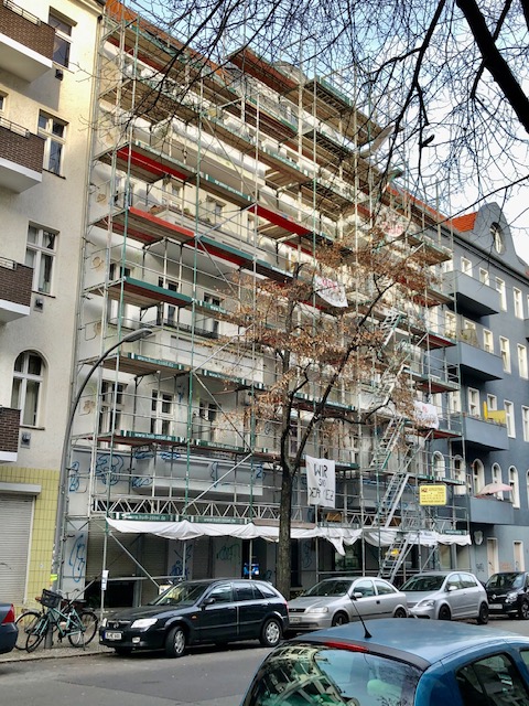 Es geht um ein Gerüst, das nun seit einem Jahr das Haus verstellt, dieser Jahrestag soll nun „gefeiert“ werden. Es geht um eine Fassade, die offenbar gezielt beschädigt wurde, damit sie anschließend saniert werden und damit diese Sanierung für Mieterhöhungszwecke verwendet werden kann. So stellt es die ausführliche Chronik dar, welche die Mieter*innen auf ihrem Blog erstellt haben.