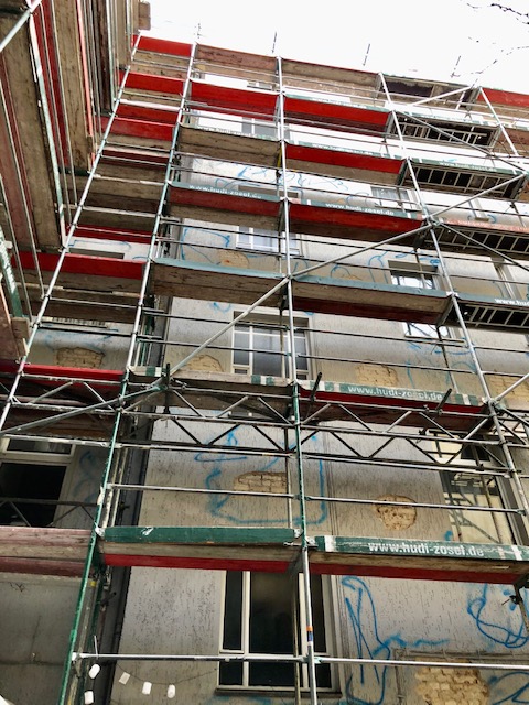 Was uns auf den Fotos vom Haus auffällt, die man im Blog findet, ist, dass die rückwärtigen Fassadenteile des Hauses wirken, als seien sie vor der Einrüstung gar nicht beschädigt gewesen und man sieht deutlich, wie sich deren Zustand durch Bohr- und Stemmarbeiten negativ verändert hat. Allerdings scheint eine Giebelfassade ein Sonderfall zu sein, weil sie in schlechterem Zustand ist als die übrigen Wände. Deswegen hat das Bezirksamt offenbar unter Auflagen einer Fassadensanierung zugestimmt und die Giebelfassade ist mittlerweile (ebenfalls) eingerüstet.
