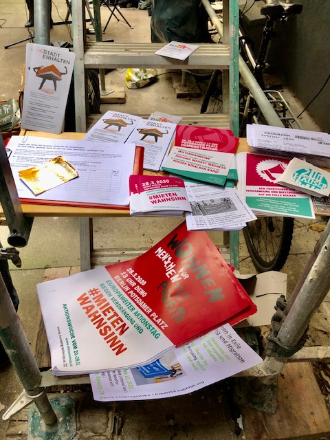 Material im Kampf gegen Verdrängung: Wir erkennen Plakate für den Housing Action Day 2020 (#HDay2020), Folder von den „200 Häusern“ (@200Haeuser) und von der Initiative gegen Signas neues Karstadt am Neuköllner Herrmannplatz.