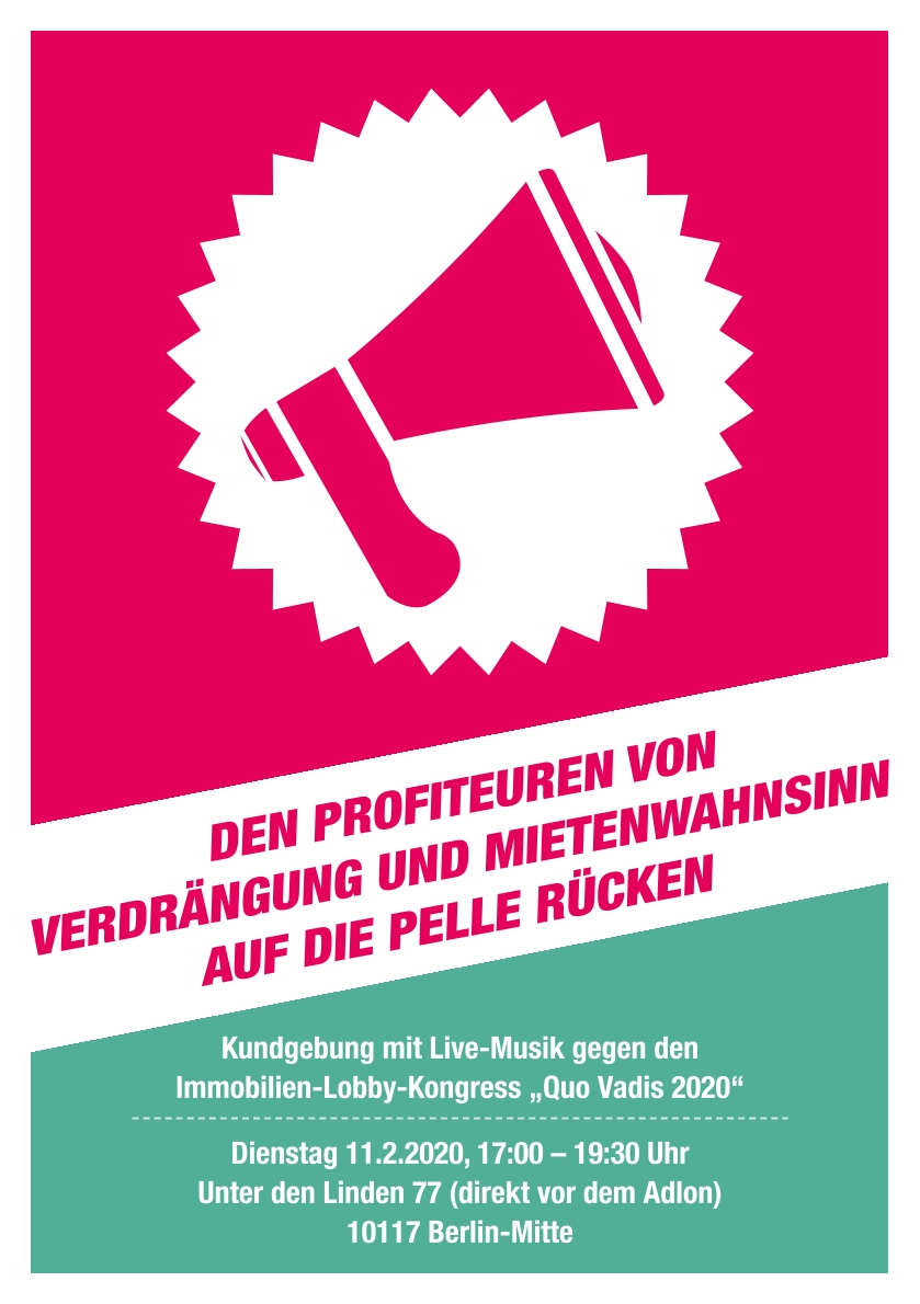 Vom 10. bis 12.2.2020 findet zum 30sten Mal der Immobilien-Lobby-Kongress „Quo Vadis“ im Berliner Hotel Adlon statt. Für schlappe 3000 Euro Eintritt wollen dort Banken, Politiker*innen und große Immobilienkonzerne planen, wie sie weiter ungestört ihre Profite mit der Miete einfahren können.