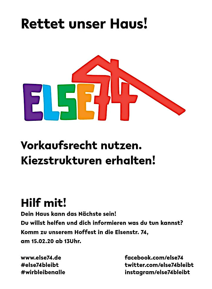 Der Besuch der Webseite des Hauses lohnt sich, unter anderem kann man mehr über einzelne Mieter*innen lesen und im Fotoalbum die Entwicklung des Else-74-Logos nachvollziehen, Plakate und das Haus anschauen und wie derzeit in der Nachbarschaft Werbung fürs morgige Hoffest gemacht wird. Hier ein schönes Plakatbeispiel: