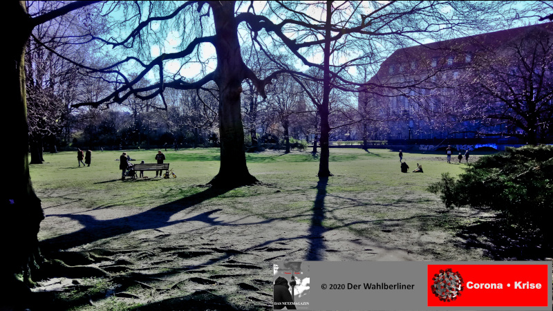 Deswegen haben wir für #19 (hier zu #18) das Titelfoto geändert. Wir haben es gerade eben in einem Park in der Nähe unseres Kiezes geschossen und nennen es „Sunny Physical Distancing in Berlin in Springtime“ (oder so). Die Menschen haben sich an diesem kühlen, trockenen Frühlingstag zumindest auf unserem Weg und im Park daran gehalten. Diejenigen, die in Gruppen zusammen waren, waren in der Regel als Angehörige eines gemeinsamen Haushalts zu identifizieren – als Familien oder Paare. Unterdessen steigen die Fallzahlen in Berlin wie erwartet, vorerst weiter an.