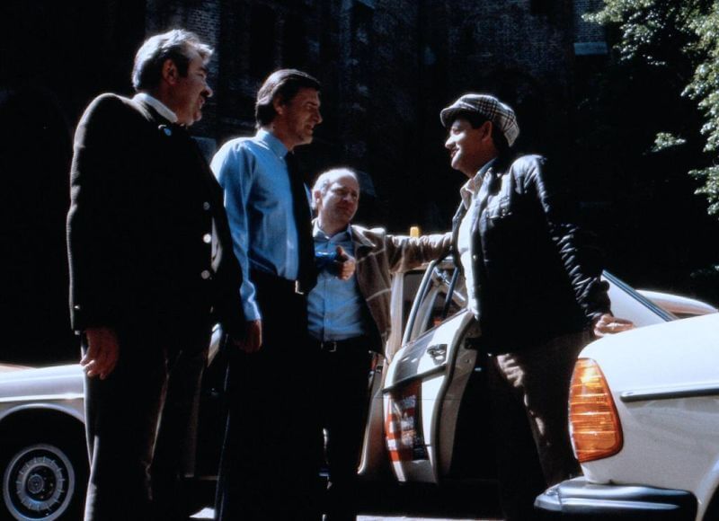 Schon wegen dieses realistisch wirkenden Übergangs hat der Film eine schöne Authentizität, und wenn man das Spiel von Helmut Fischer mit seinen früheren Auftritten in der zweiten Reihe und seinen letzten Tatorten als Leitender Ermittler vergleicht, passt ebenfalls alles: Er spielt deutlich dominanter als zuvor, aber seine Figur wirkt noch nicht in jeder Situation sicher und überlegen. Am besten merkt man das, als er sich von dem Anwalt, der erpresst wird, emotional in den Fall hineinziehen lässt und sich tatsächlich als Taxifahrer verdingt, um an die Verbrecherbande heranzukommen. Da sein Gesicht damals in der Szene noch nicht bekannt gewesen sein dürfte, wirkt auch das stimmig. Da kommt er also so bieder rüber, dass sich das weibliche Bandenmitglied sicher ist, dieser Mann kann kein U-Boot sein. Na bitte.