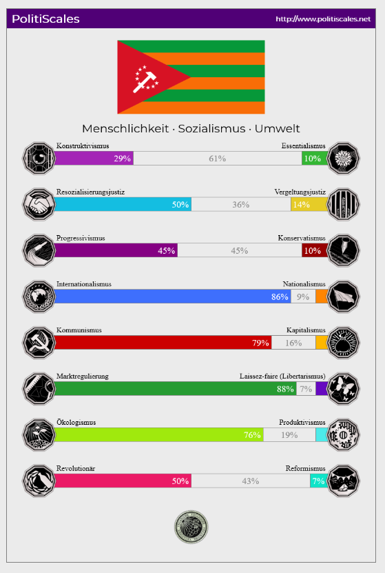 Okay, das Ergebnis entspricht weitgehend den Erwartungen. Dass wir dagegen sind, die Wirtschaft einfach weiterlaufen zu lassen, bis die Normalbevölkerung wieder am Ausgangspunkt totaler Armut angelangt ist, also der Zeit vor der Arbeiterbewegung, das ist wohl selbstverständlich. Daher der lange grüne Streifen bei „Marktregulierung“ und der fast ebenso lange bei „Kommunismus“, wobei hier sicher keine klare Trennung zwischen Sozialismus und Kommunismus gezogen wird. Sei’s drum, es kommt auf die Inhalte an. Beides liegt eng beieinander und greift ineinander.