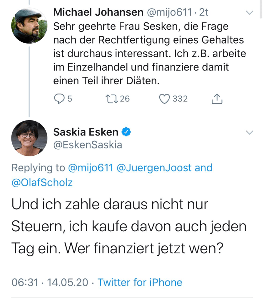 Gestern hat ein Tweet der Co-Vorsitzenden Saskia Esken für einige Aufregung gesorgt. Darin bestritt sie, dass Steuerzahler die Politiker*innen finanzieren, sondern vertrat die Ansicht, es verhalte sich genau umgekehrt. Das führte zu 100 Retweets, 122 Likes, aber fast 1.500 Antworten (Stand 16.05.2020, 14 Uhr).