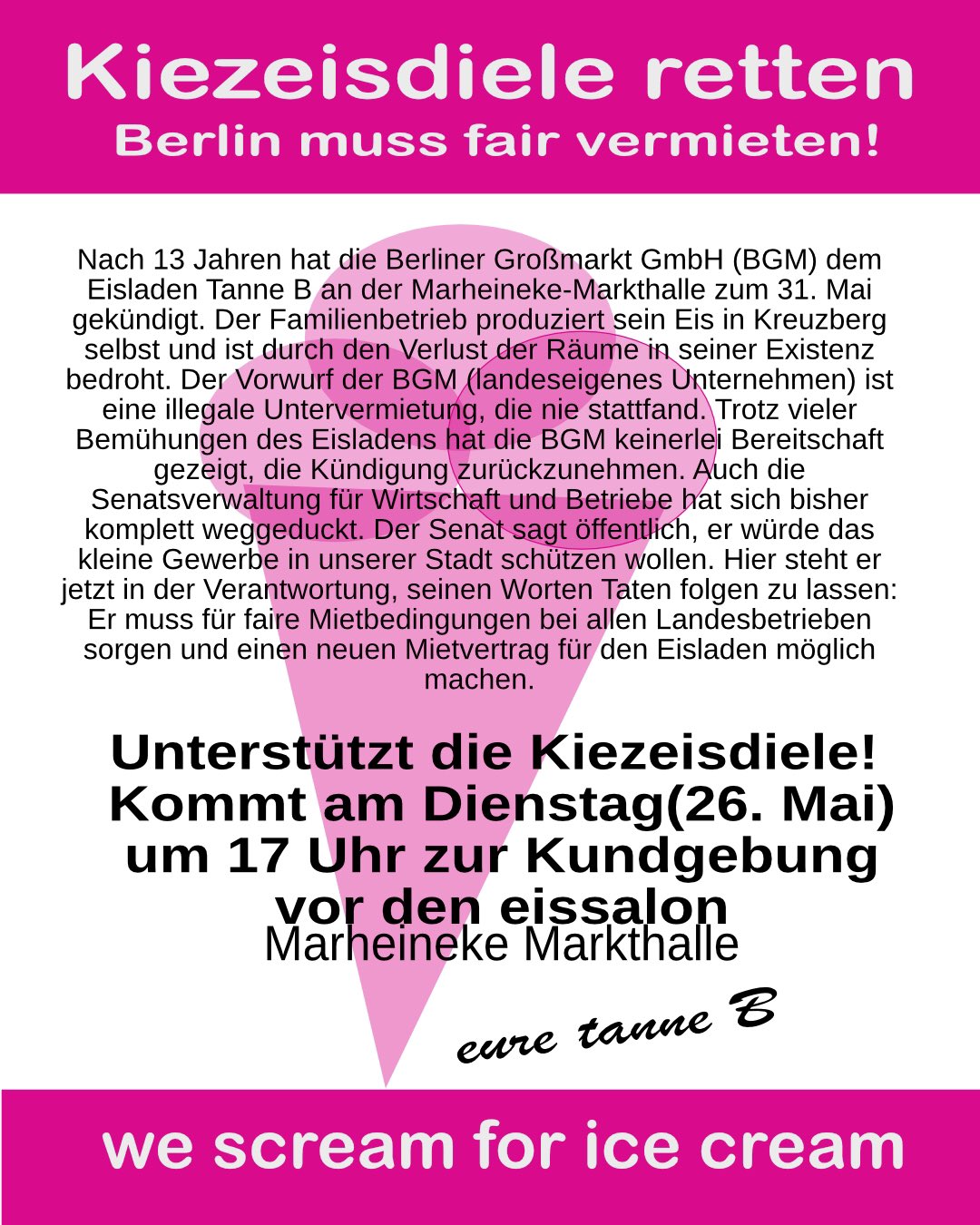 Geht alle morgen um 17 Uhr zur Demo für den Erhalt der Kreuzberger Eiskultur! Adresse: Marheineke Markthalle – Marheinekestraße 15, 10961 Berlin.